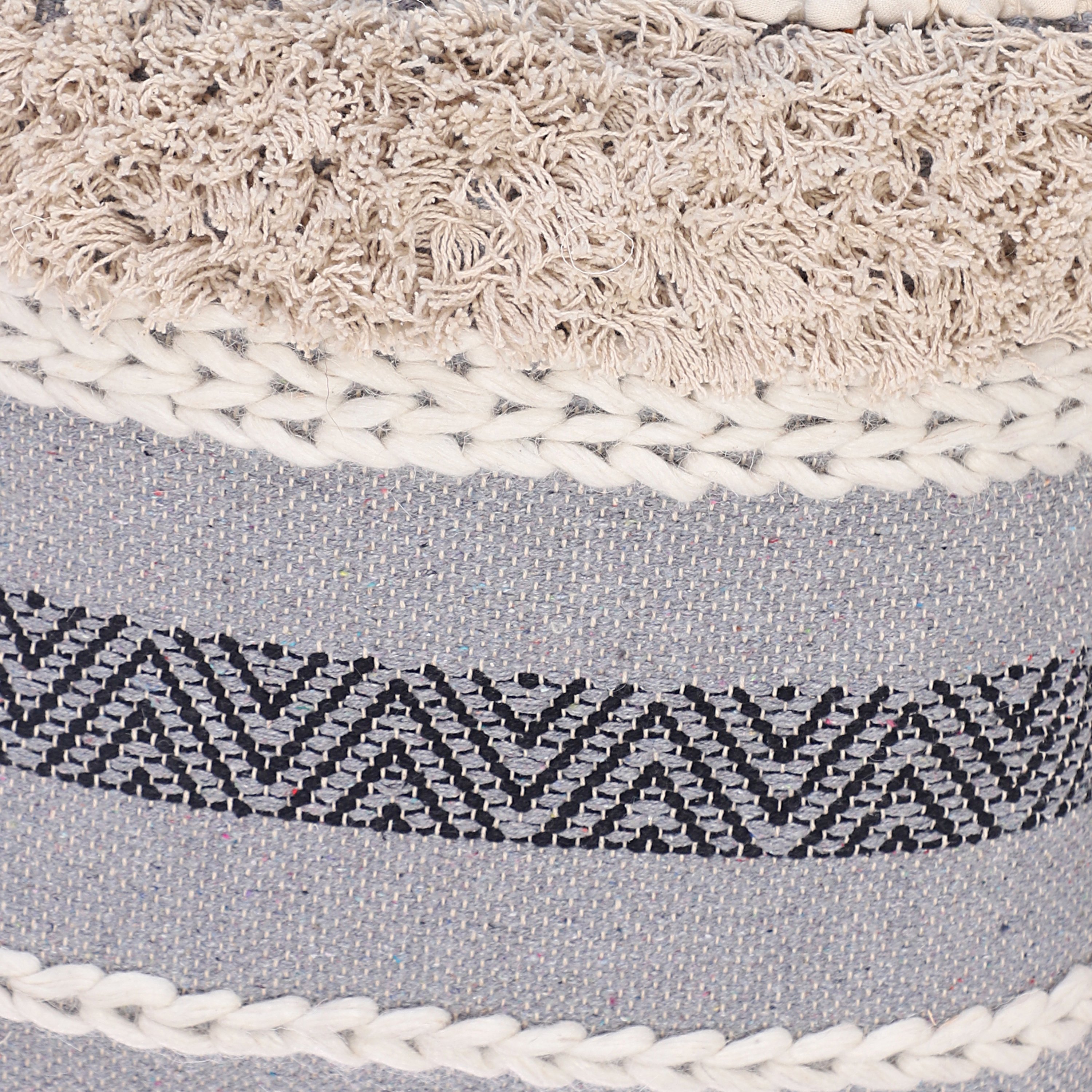 Geometric pattern and white woven yarn imparts a unique flair to it