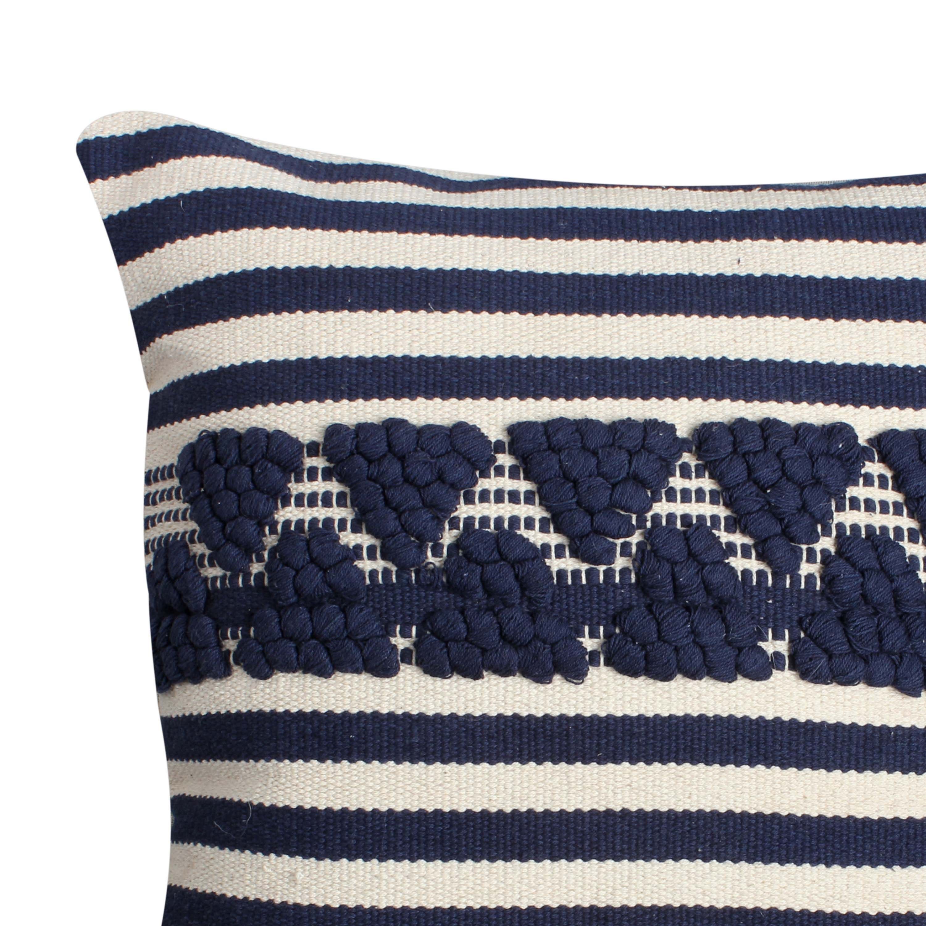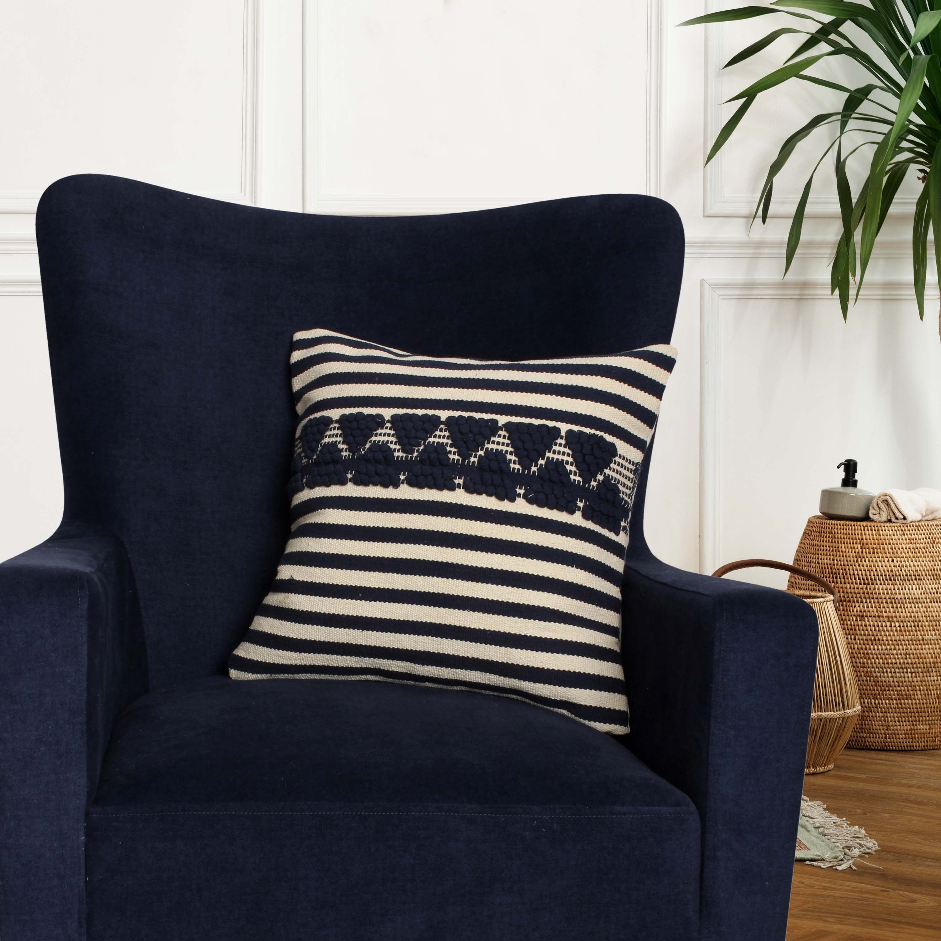 Description:A minimalistic design with a unique combination of subtle white and vibrant navy blue, this accent throw pillow makes a gorgeous fit for your assorted sofa cushions, bed set pieces, or accent chairs. Depicting a simple striped and textured triangular pattern, it is generously filled with soft siliconized polyester for all day comfort. The cotton fabric cover has a concealed YKK zipper, allowing you to easily remove the cover while cleaning, and this square shaped pillow comes with a clean edge finish for a simplistic look.