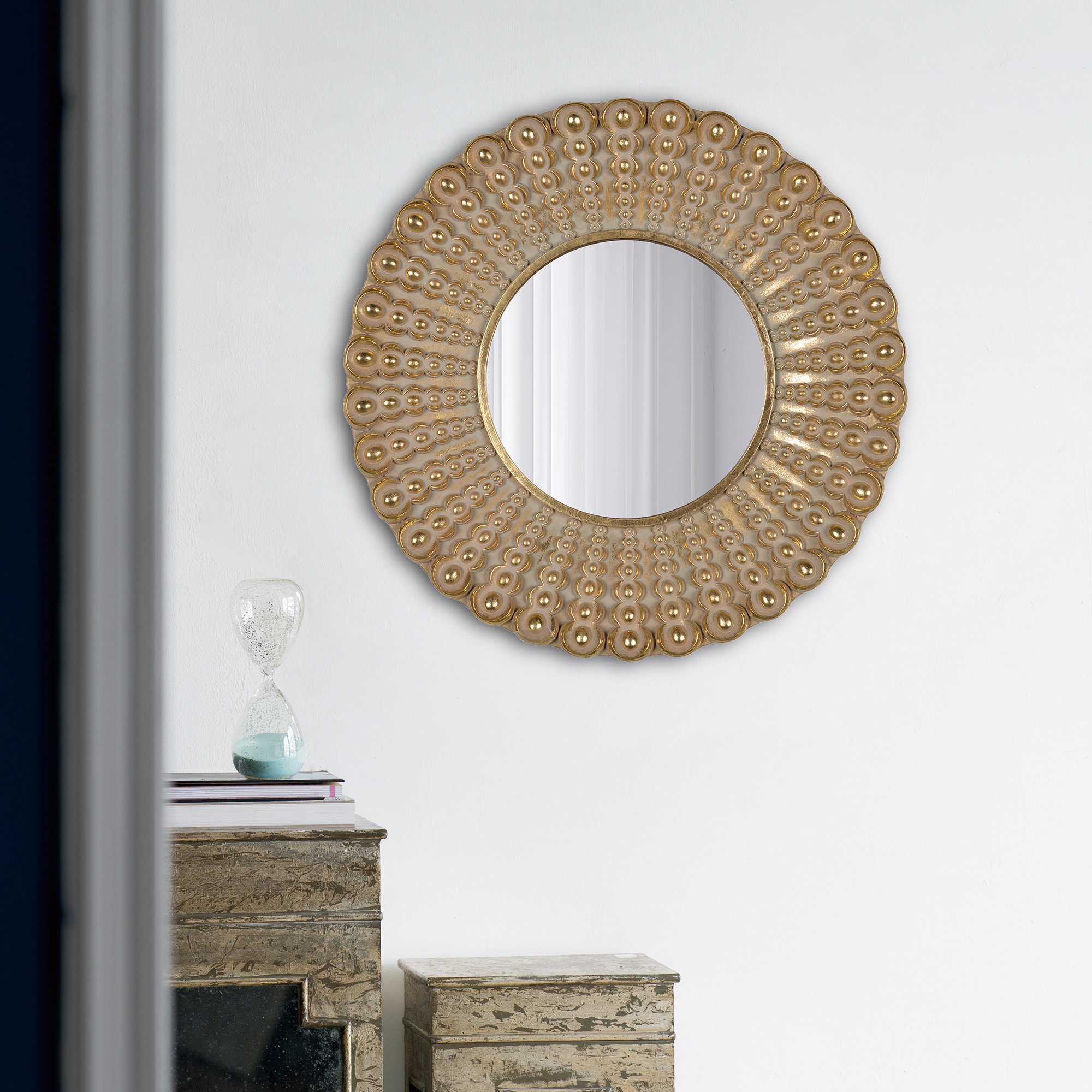 Description:The DesignWith its gleaming gold hue and radiant beaded sunburst design, this round decorative mirror draws inspiration from alluring artworks to create a unique, sophisticated statement piece. Measuring 18.5H x 2.5D x 18.5W, this mirror will thrive as a warm centerpiece in any room in your home, with the lustrous colorway adapting to complement a wide variety of interior styles.