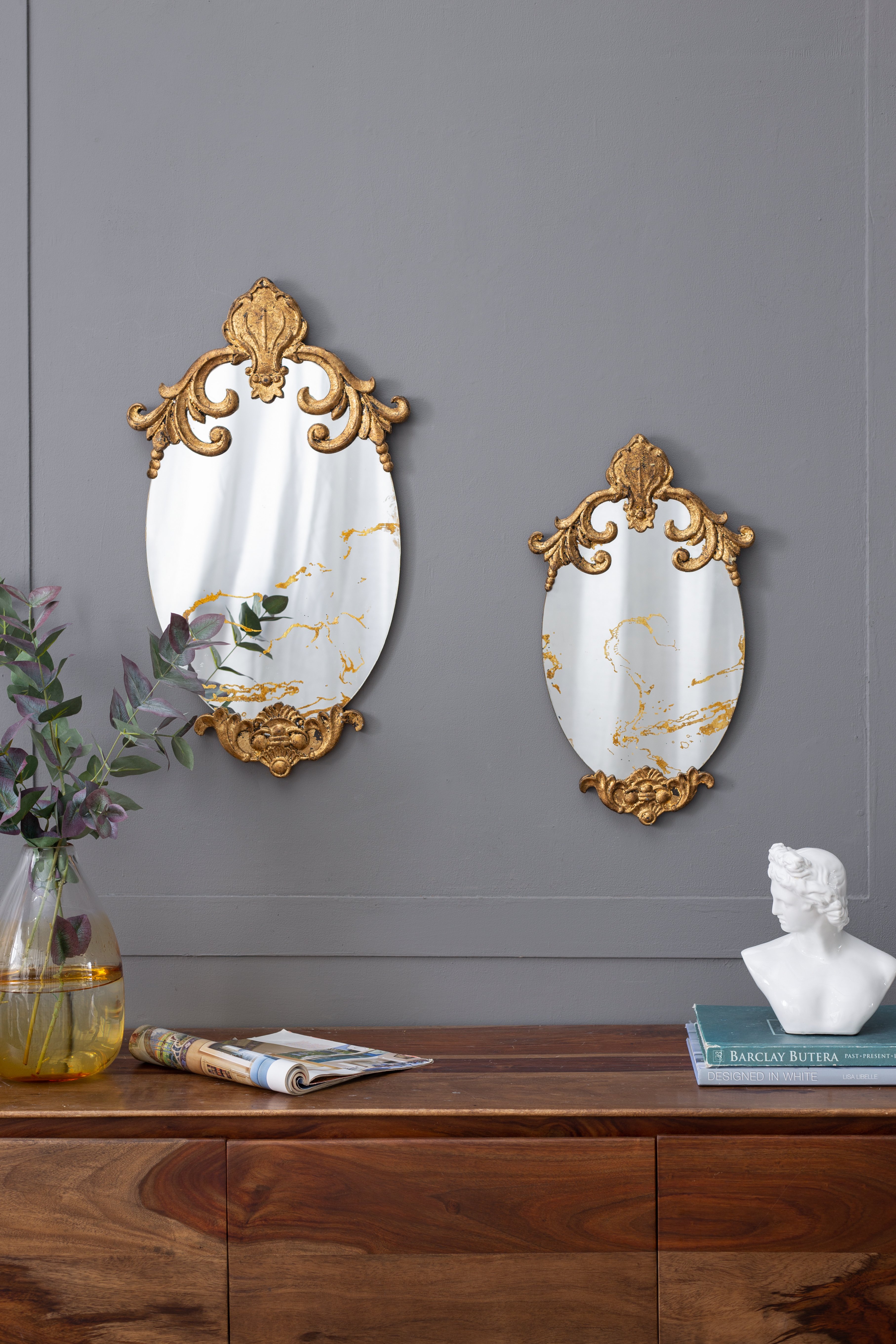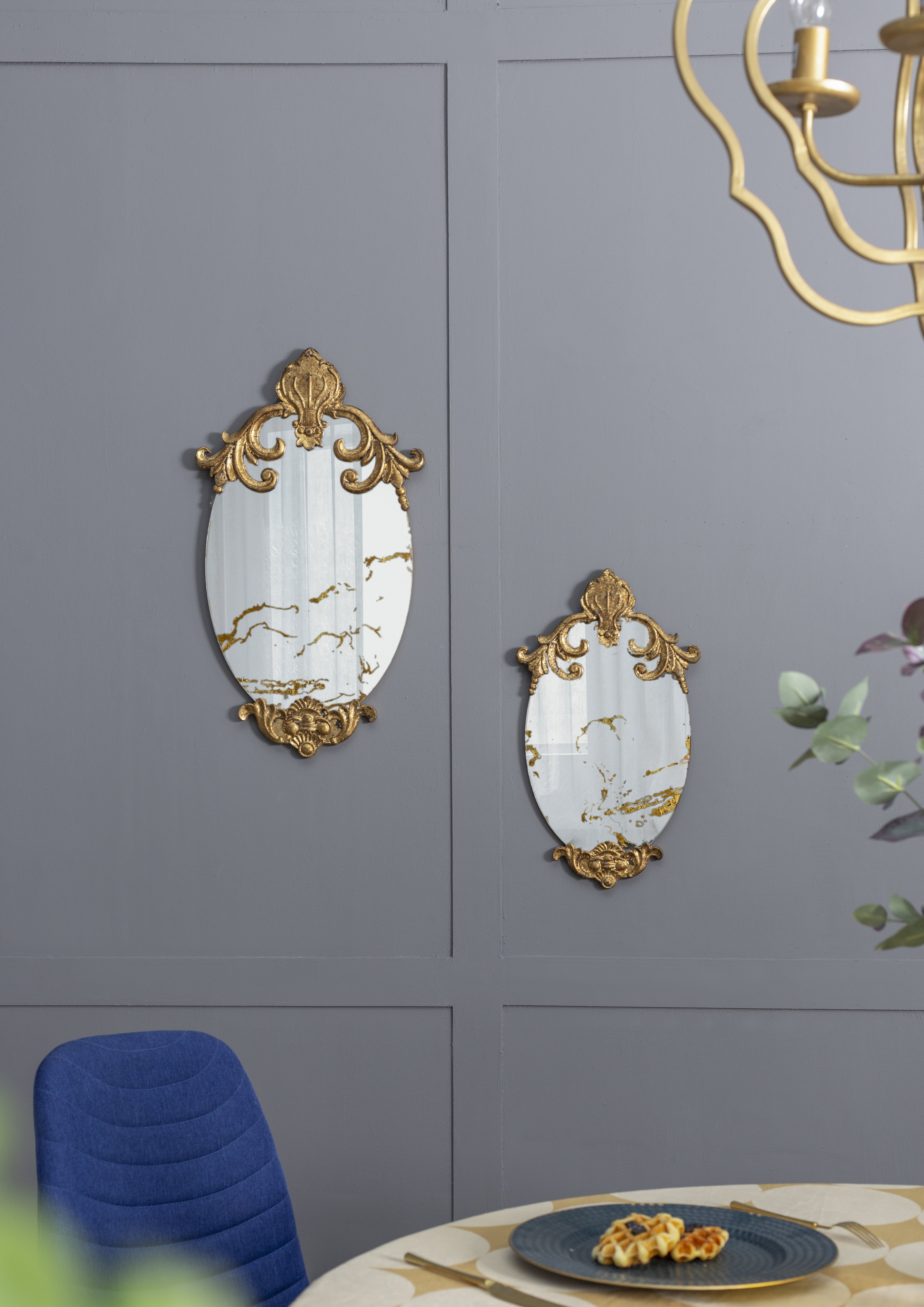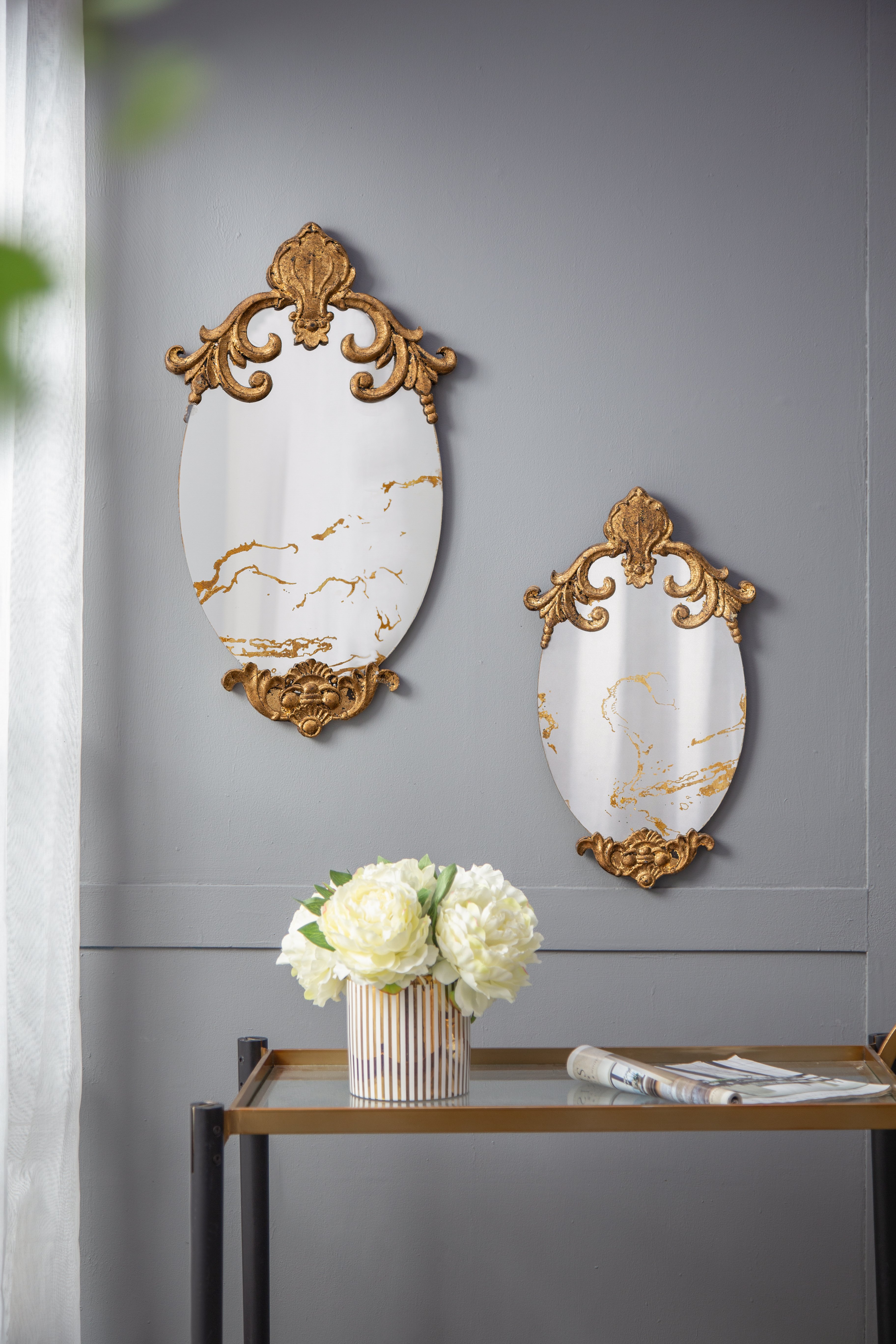 Description:The DesignWith its oval silhouette, antique gold colorway, and alluring scrollwork design, this decorative accent mirror is sure to embellish your home decor. The resin frame allows for such rich details to be possible,while the MDF backing infuses this piece with a durable yet lightweight touch.Measuring 20.5H x 12W,this mirror is the perfect size to add a layer of regal whimsy to any room in your home.