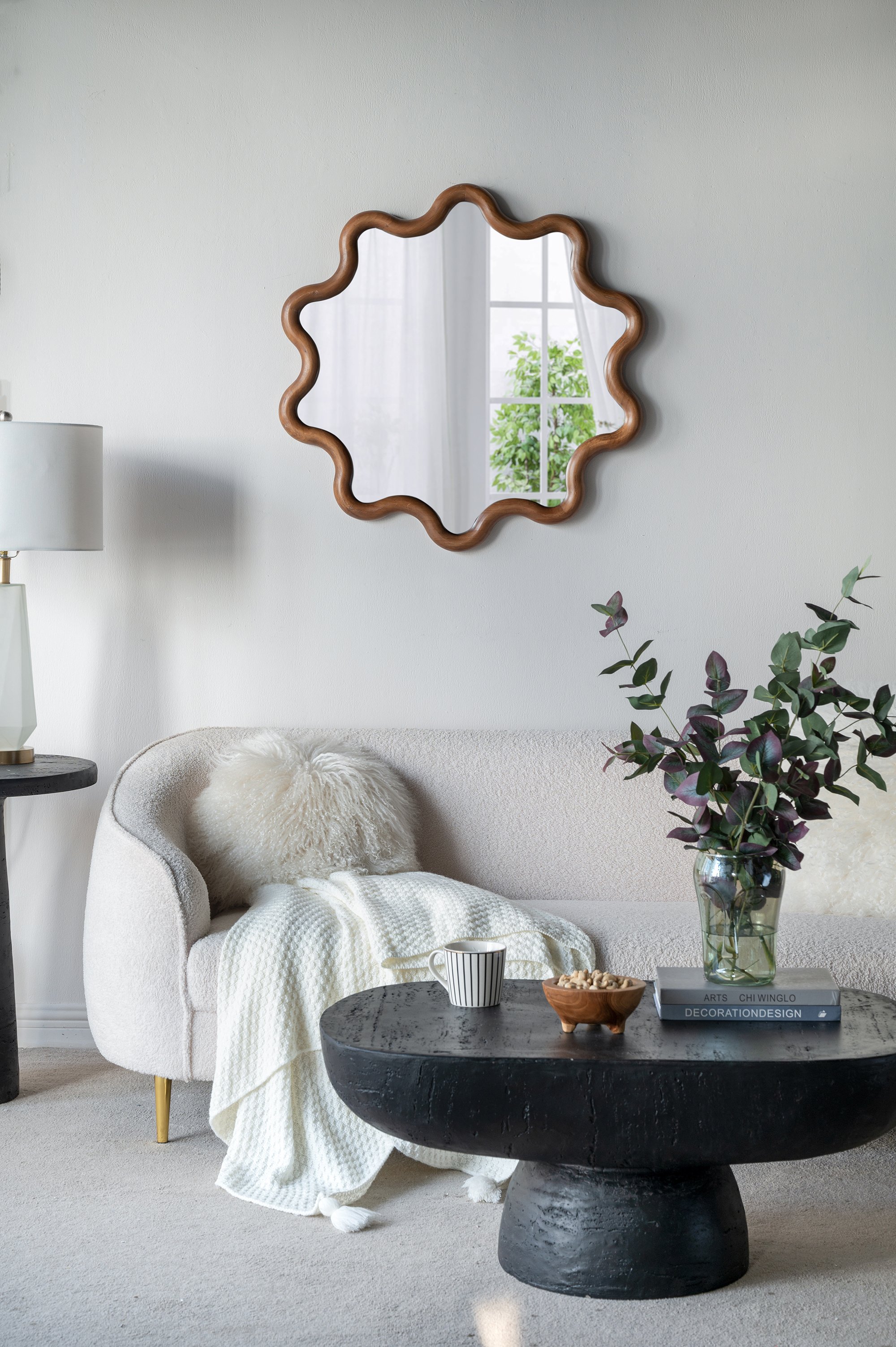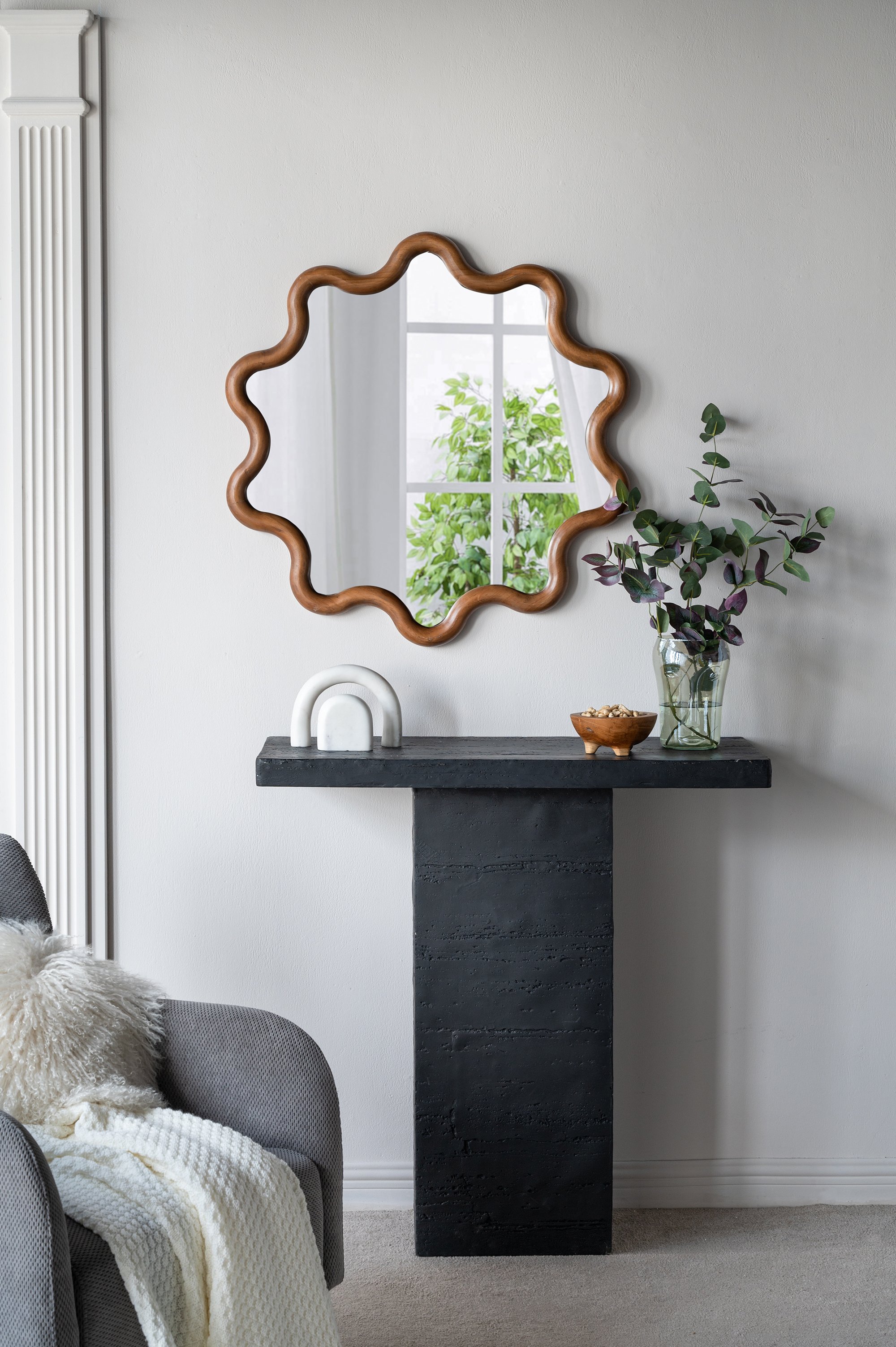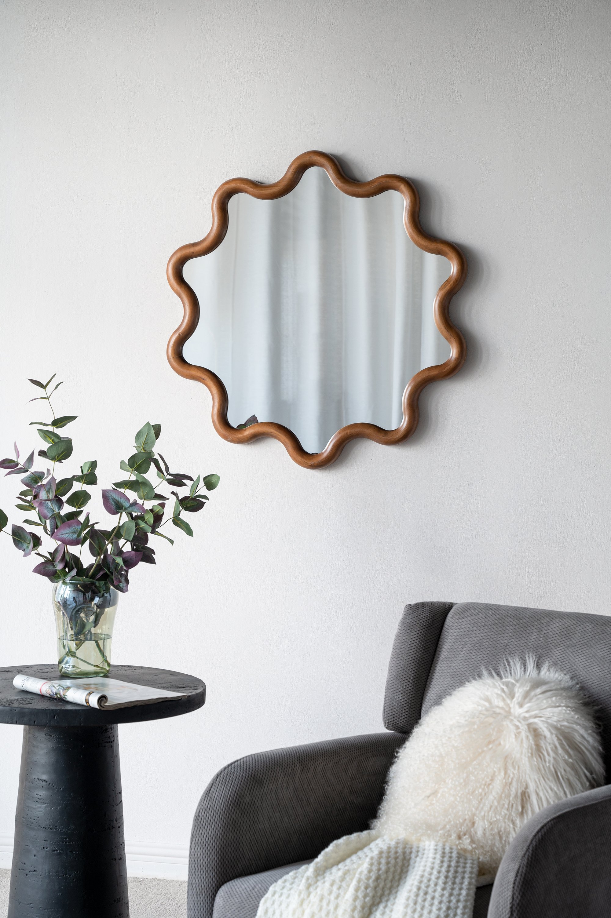 Description:The DesignBreathing fresh life into the classic wall mirror, this piece boasts a uniquely designed wave-like frame that is finished in a natural dark brown. Crafted from a blend of strong pine wood and eco-friendly MDF, this mirror is sure to elevate the decor in your home or office for years to come. Measurements: 30W x 31H x 1.5D.