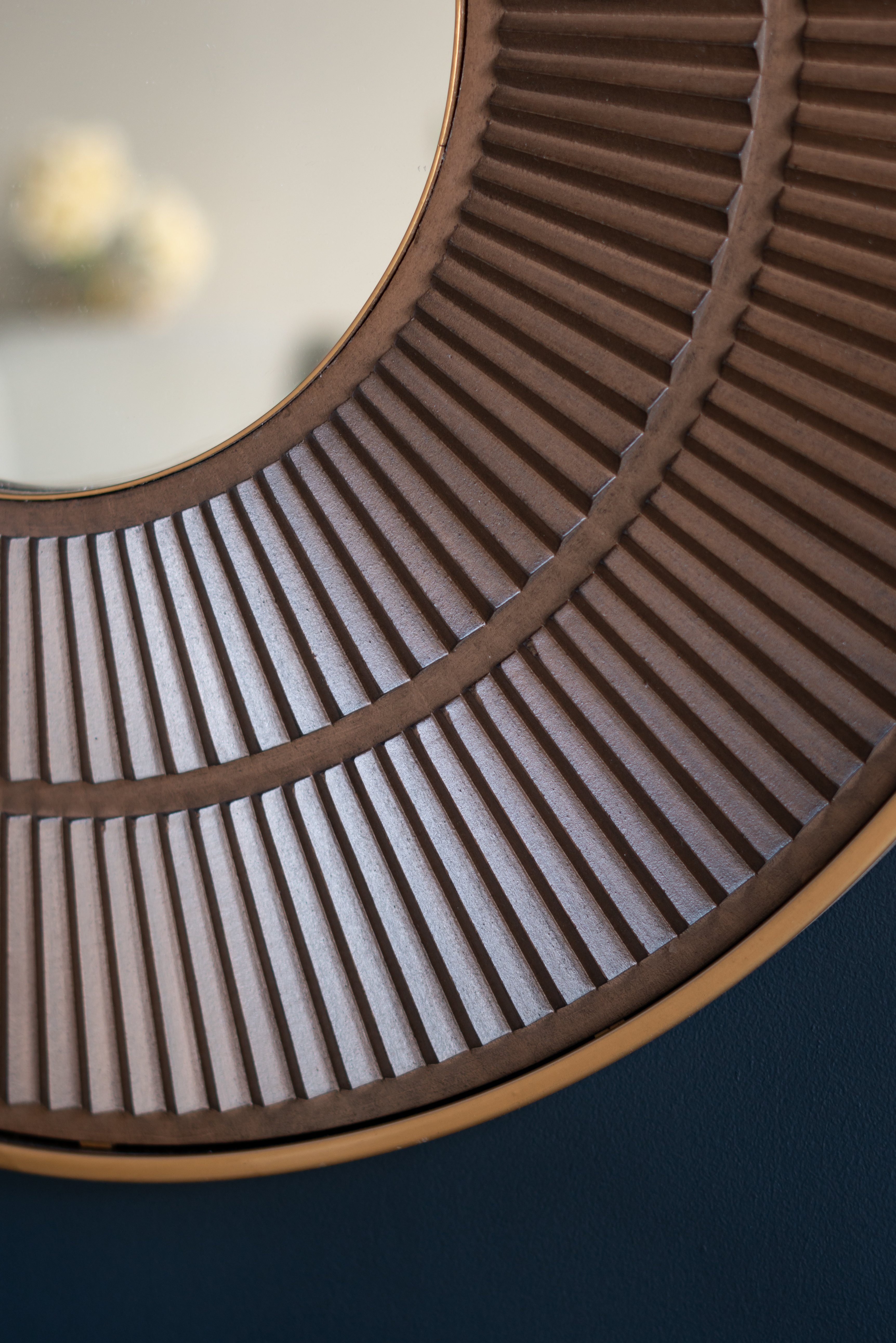 Description:The DesignFramed in striking gold iron, this decorative accent mirror boasts a rich brown wood border that provides the perfect touch of contrast. Completing the unique visuals, an intricately carved pleated pattern surrounds two rings that lead to the mirrored glass. This mirror will thrive in any room of your home, with the neutral colorway complementing a wide variety of interior styles.