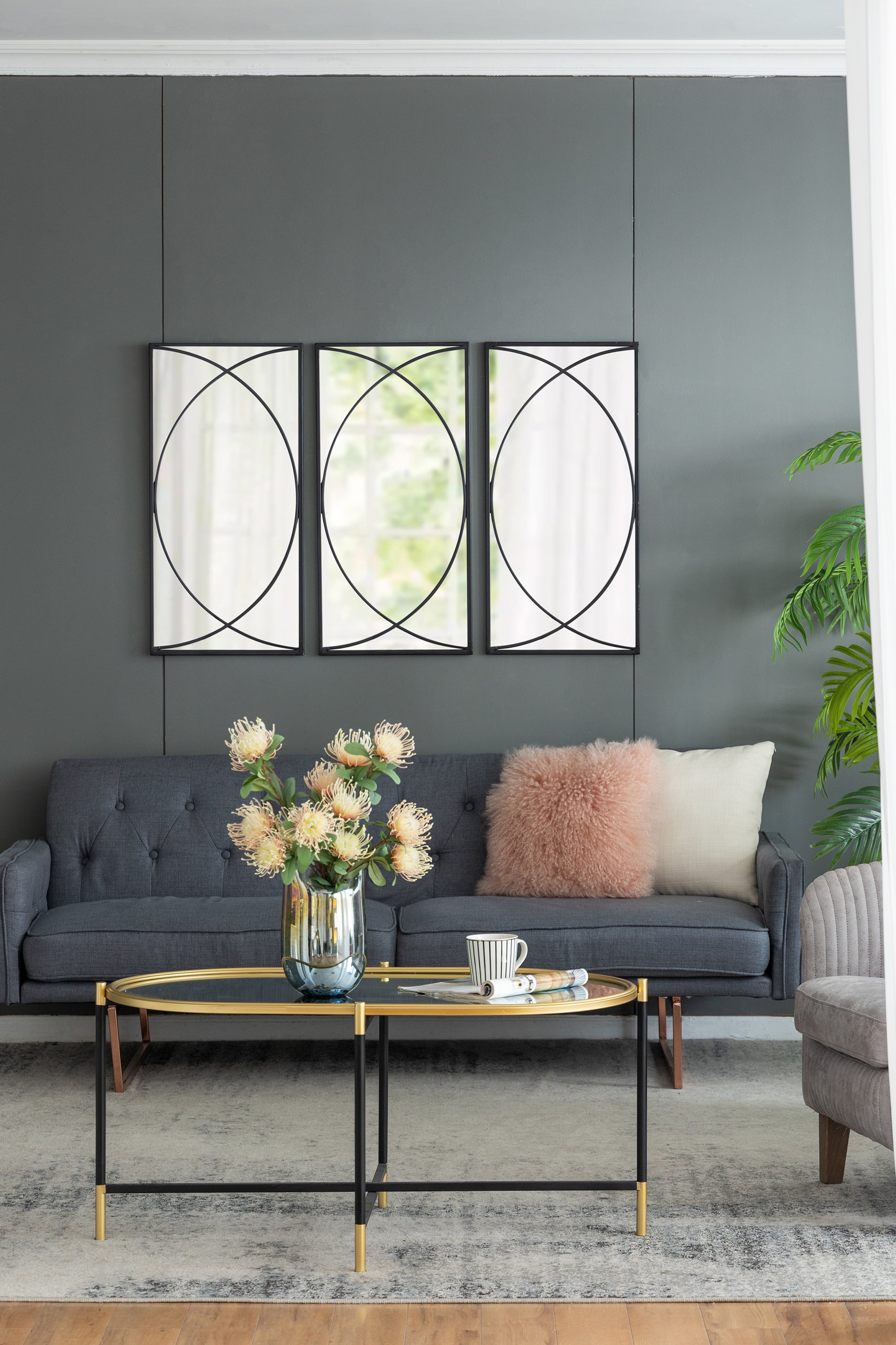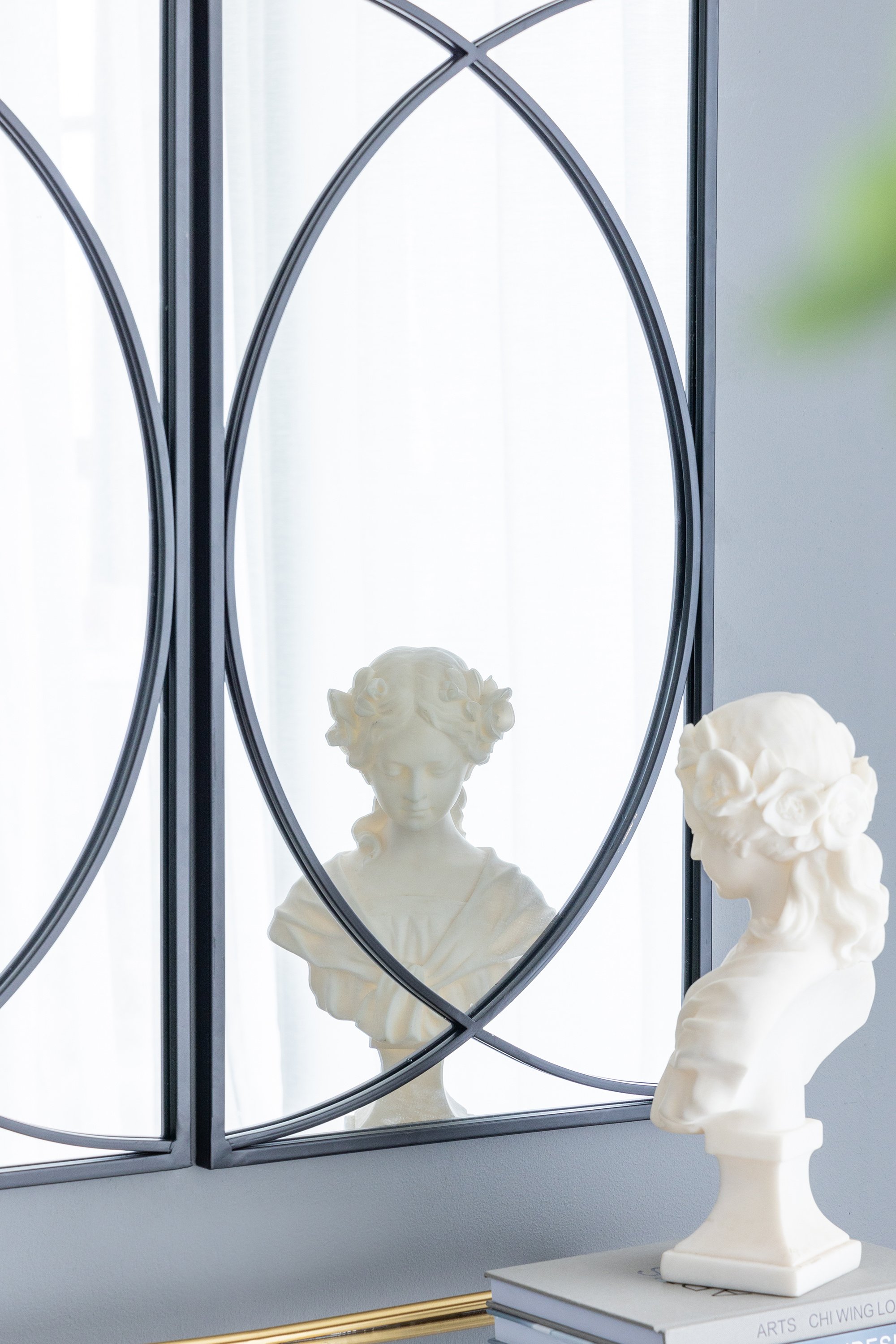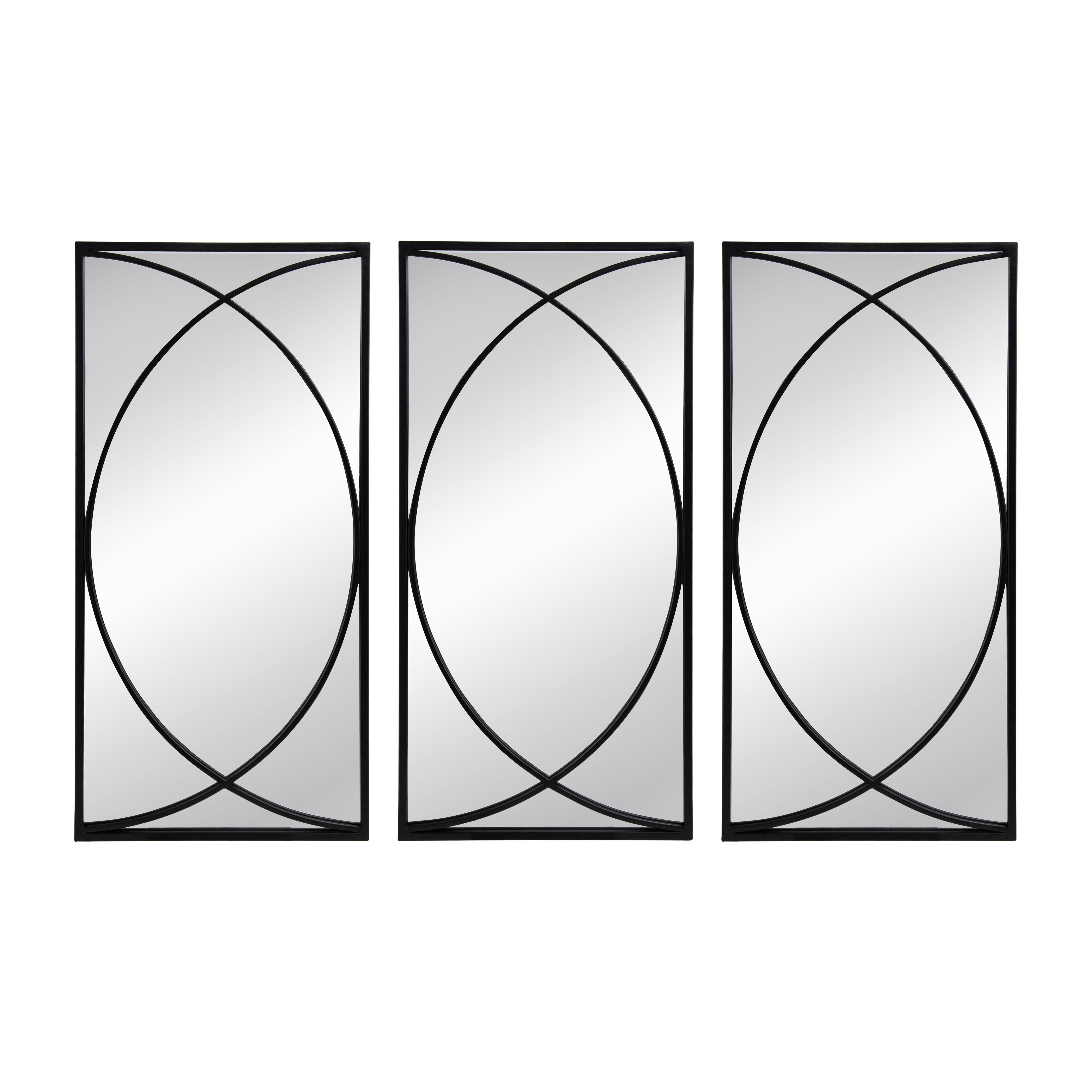 Description:The DesignCapture a glimpse of industrial design when you look into the Set of 3 Black Metal Mirrors. Align this set of contemporary mirrors to create the crossed iron ring design displayed across all three mirrors. Balance the room and anchor down any design with the black iron frame that reflects off the mirror behind it. Accent a dining room wall in an industrial style home with this set of 3 mirrors.