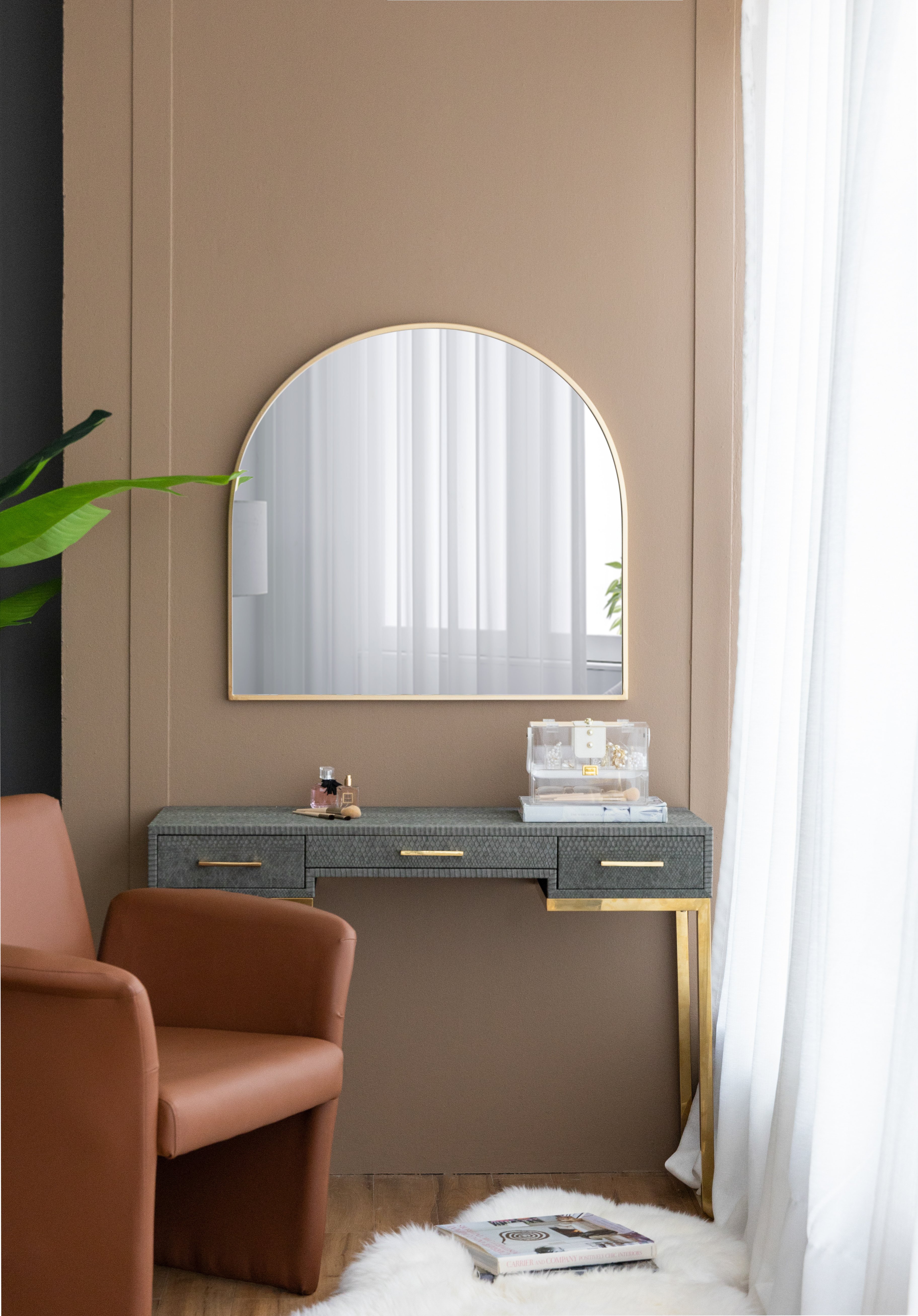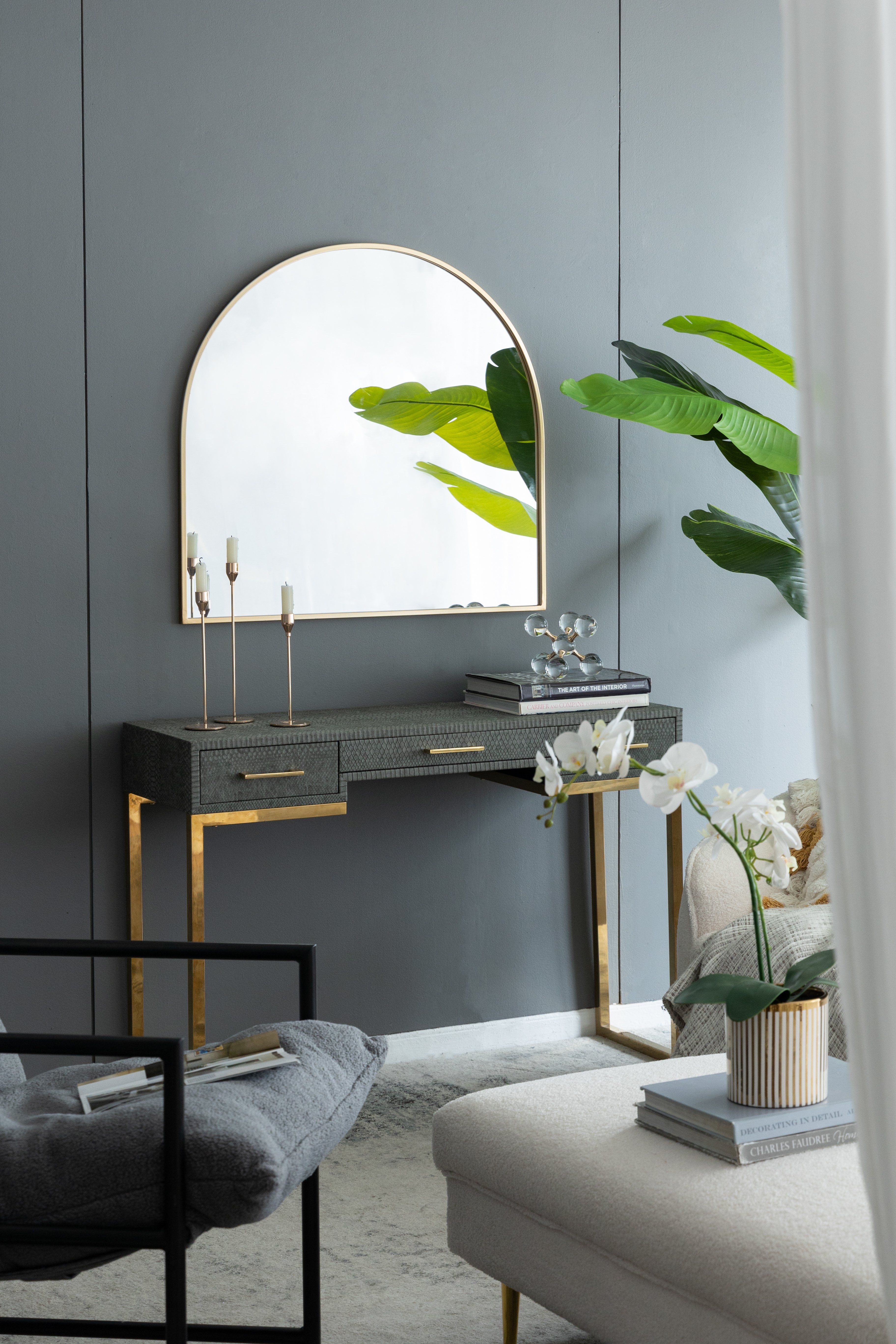 Description:The DesignThis mirror features a rounded arch top with a smooth gold frame. Due to the simple silhouette, this mirror can fit into a wide variety of styles and decor seamlessly, providing a subtle modern charm to any space in your home. Measures at 33 x 31, making it a perfect accent for your bedroom, bathroom or entryway. It could also be rested against a wall atop your dresser or mantel.