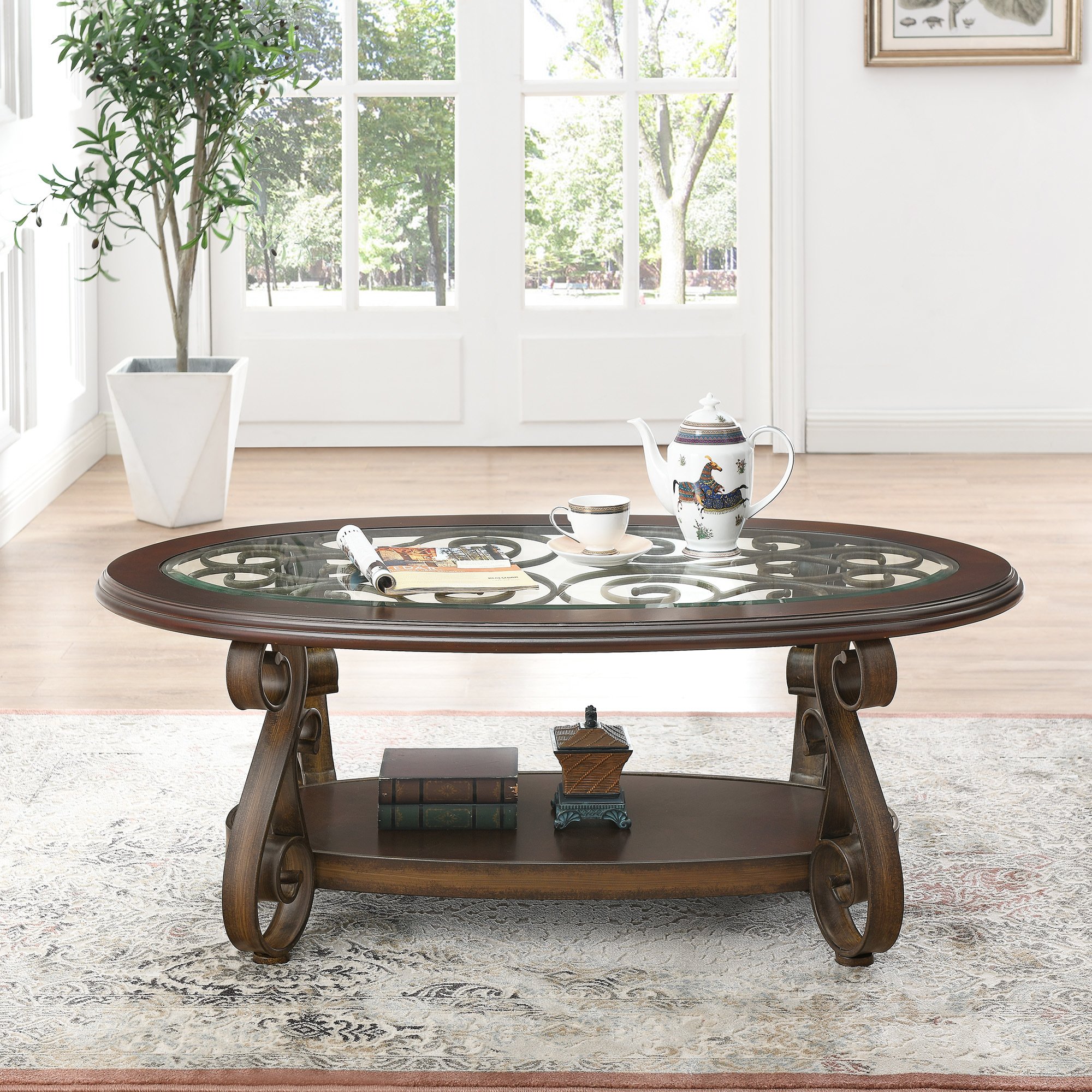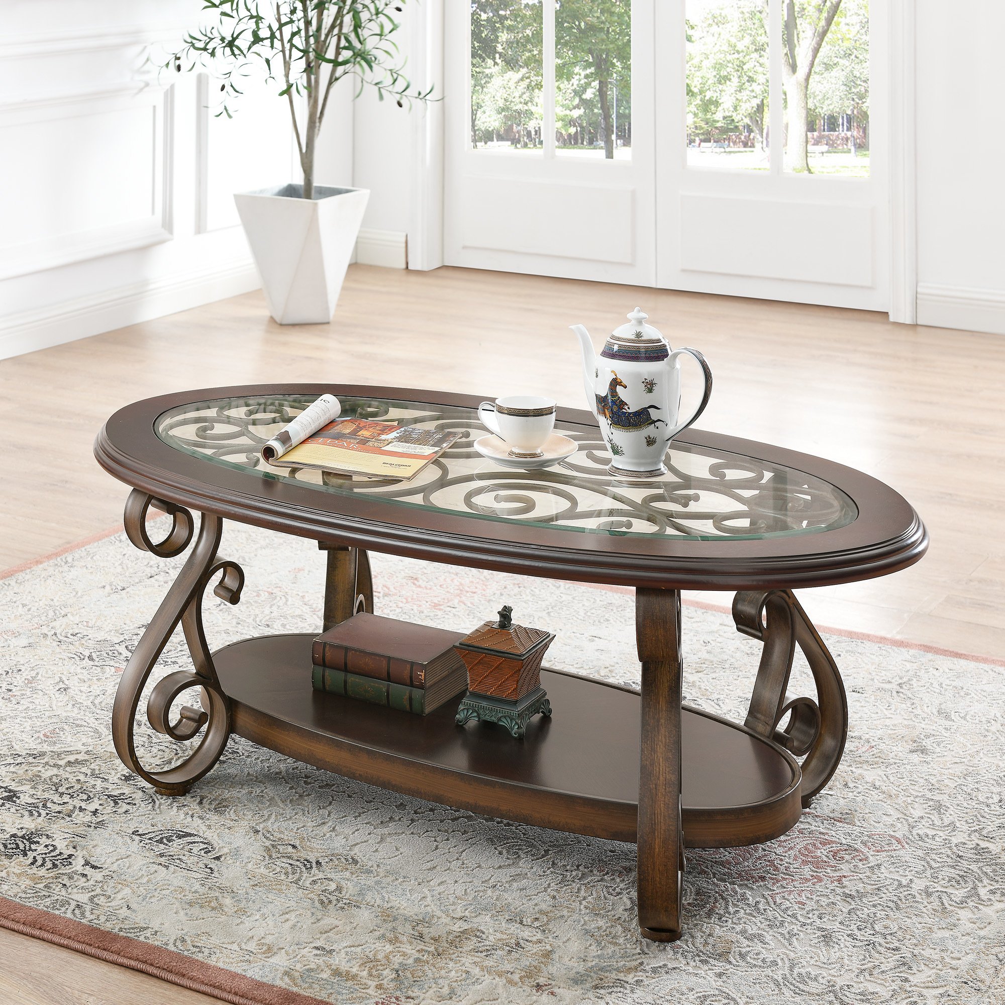 5.Blending classic and rustic elements, it brings elegant style to your living room and blending well with any home decor. The iron pattern under the glass makes the table more artistic.