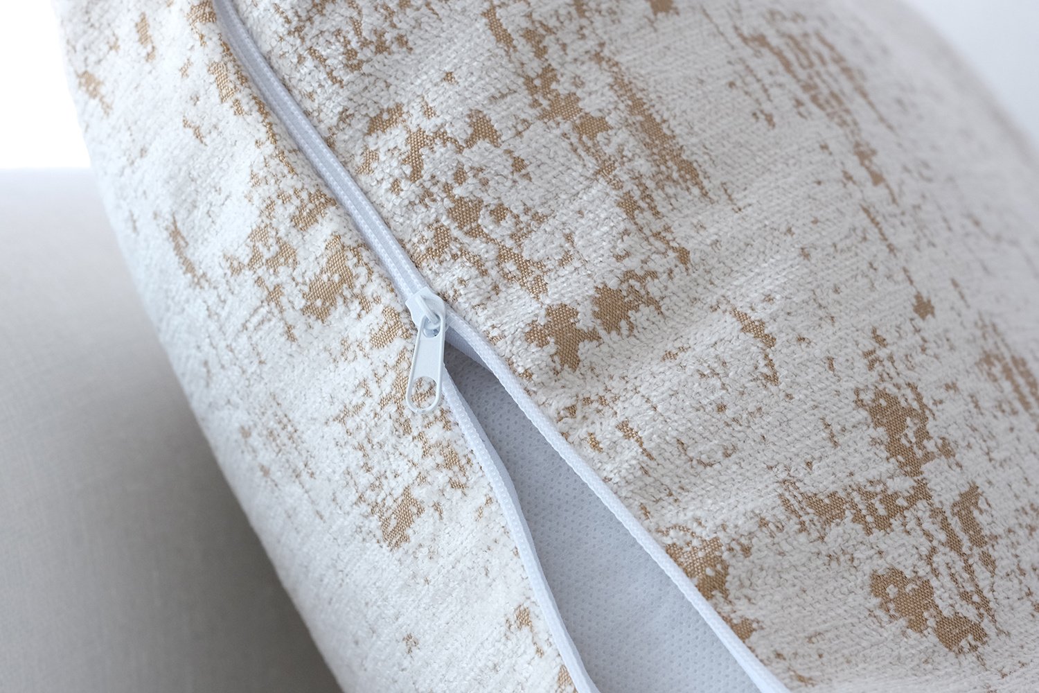 Place this striking and interesting throw pillow case on your couch and instantly elevate your space with a nice colorway of beige and gold. It features an abstract chalk line texture that compliments well the blend of colors. Perfect for any chairs and sofas, you can add this luxurious pillow anywhere in your home. It is made from premium quality fabric that is super soft and durable. It works in any interior.Beige and Gold Chenille Throw PillowContemporary Square StyleDimensions are: 18"L x 18"W x 5"HZippered