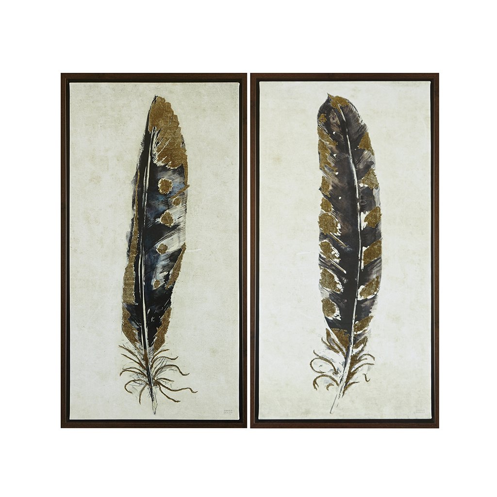 Description:DescriptionGilded Feathers by Artist Symposium Design is a stunning art piece that will add drama to your home. This piece features feathers in rich black hues along with gold foil detailing that adds a nice sheen and luster for an eye-catching accent. These beautiful Gilded Feathers are then finished with a walnut frame for a more natural look to balance your space. With 2 D-rings on the reverse of each piece for easy hanging, this framed wall art set provides a soft, elegant update to any room. Spot clean only and comes as a two piece set, with each piece measuring 16.75x31.75."Product DetailsSee below2 Pieces:16.75"W x 31.75"H x 1.625"D (2)MaterialWood: 50%Polystyrene: 40%Canvas: 10%