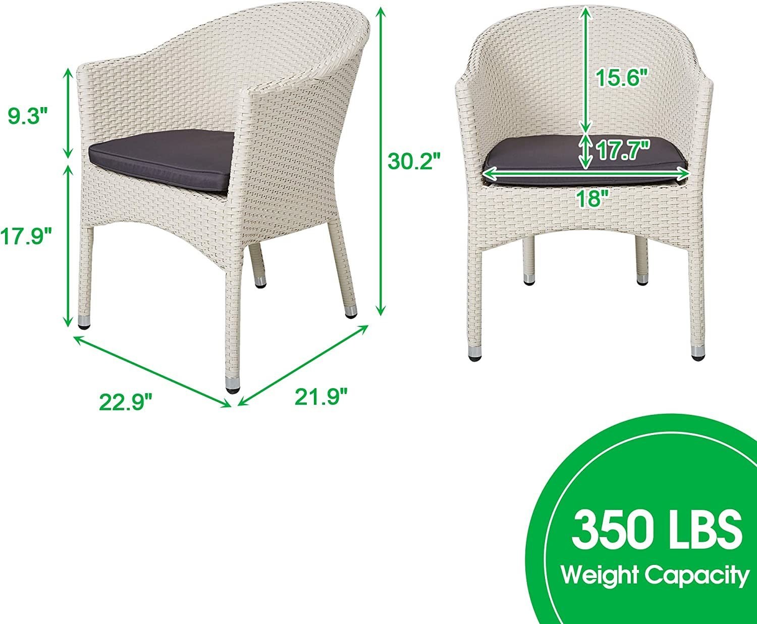 Sturdy & Durable | Constructed with high quality steel frame super solid.Breathable PE rattan ; which is compact and durable ; great for indoor and outdoor use. No Assembly Required | Full assembled stackable patio dining chairs .1 chair in a package.You don't need to spend extra time assembling it.It also has excellent weight capacity (hold up to 350lbs). Ergonomics Seat | Seat cushion is removable; hidden zipper help it easy to disassemble and clean.Our chairs have a wide enough seat and equipped with a curved backrest ; which perfectly fits the curve of the back for more comfortable sitting. Widely Use | This natural style chair is suitable for any outdoor space including courtyard; patio; garden; porch; balcony; around swimming pools or indoor. More Details | Non-slip black plastic foot caps will keep from slipping and scratching the floor.the weight of each chair is around 13 lbs; easy to move.