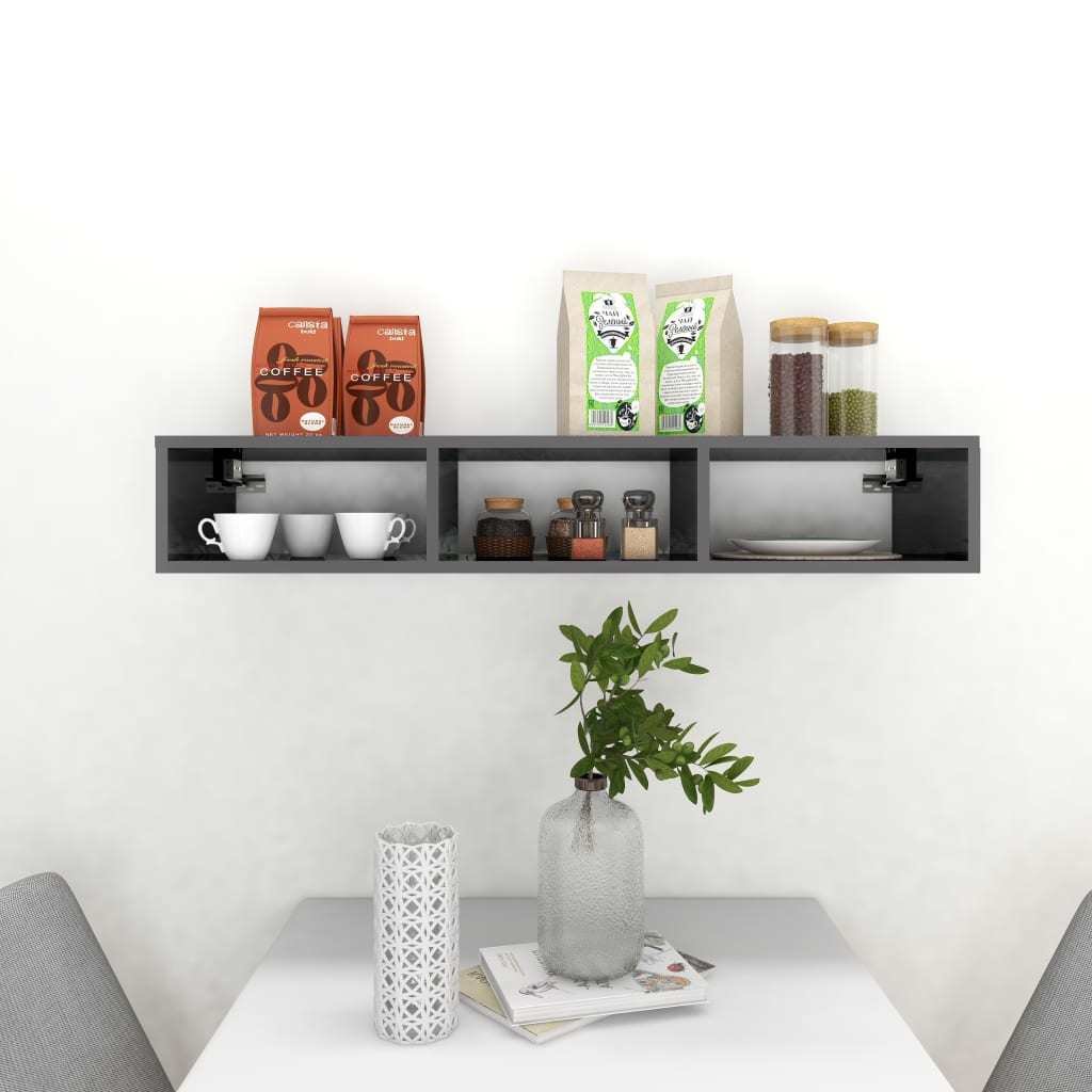 This wall-mounted cabinet features 3 compartments; meeting sufficient storage needs. The top layer provides a stable surface on which you can place your books or decorative items. The floating cabinet can also be used as a TV cabinet; bookcase; kitchen shelf in your living space. Additionally; the display shelf is easy to clean with a damp cloth.Color: High gloss grayMaterial: Engineered woodDimensions: 40.2" x 11.8" x 6.7" (W x D x H)Assembly required: YesPlease note: Screw(s) and plug(s) for inside the wall are not included. Seek and use screw(s) and plug(s) suitable for your walls. If you are uncertain; seek professional advice. Read and follow each step of the instruction carefully.California Proposition 65